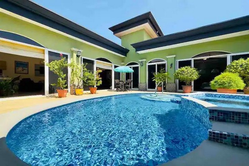 The home is arranged like a horse shoe, with the living/dining area along the bottom, and then the large master bedroom along one side and the other two bedrooms all the way on the other side of the home for privacy! The master and one of the bedrooms have sliding doors directly out to the pool, while the third bedroom has sliding doors out to its own private patio.