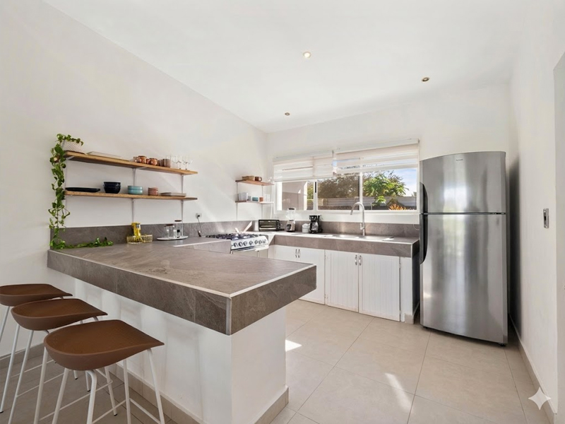 Casa Pitaya offers a practical layout that fits many types of buyers. Each of the three bedrooms includes its own en suite bathroom, while a convenient half bath adds extra functionality for guests. Because the home sits on one level, it feels easy to navigate and comfortable for everyday living. At the same time, the bright design and open feel create a relaxed coastal atmosphere.