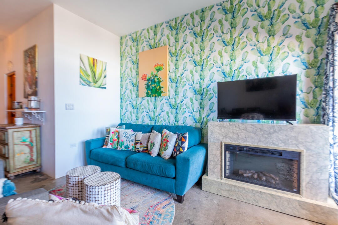 The living area is anchored by a cozy fireplace and framed by large glass doors that bring the ocean into view. Layered textiles, cheerful décor, and bold wallpaper create a warm, welcoming vibe. A comfortable sleeper sofa expands accommodations to up to four guests, adding flexibility and boosting short-term rental appeal.