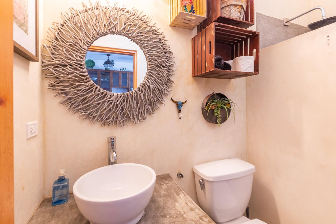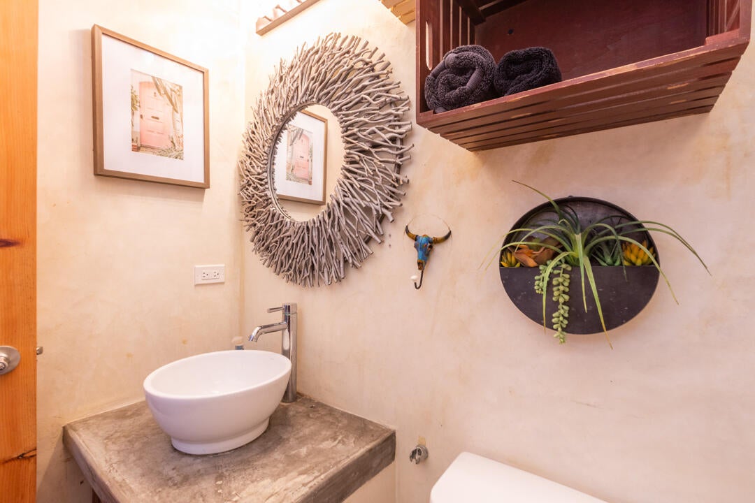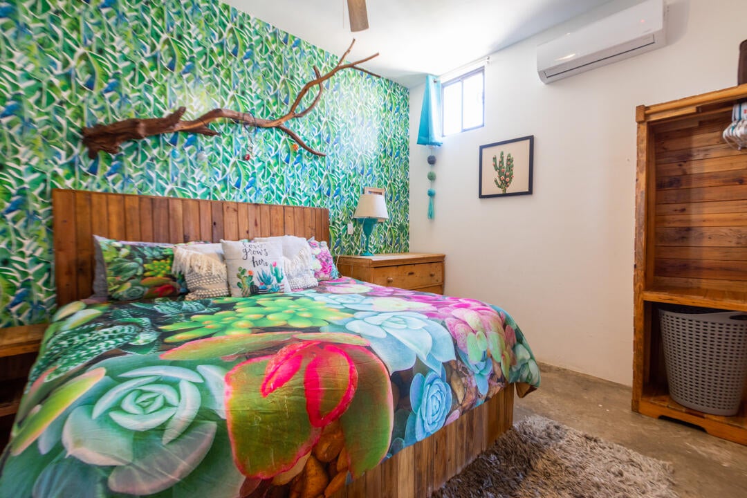 The bedroom is a calming retreat with a king-size bed, natural wood furnishings, lush botanical wallpaper, and mini-split A/C for comfort in every season. With two full bathrooms, owners and guests enjoy extra privacy and convenience—ideal for hosting friends or maximizing rental usability.