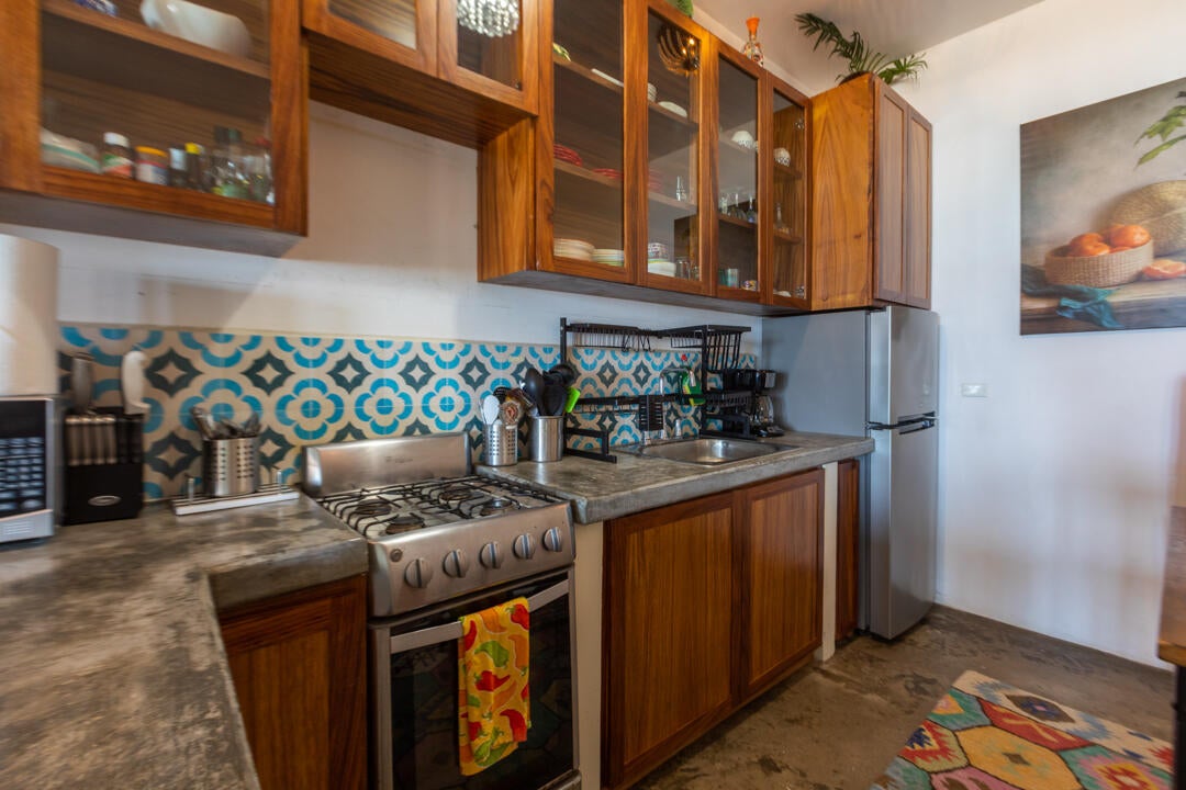 Inside, this Cerritos beach condo is full of color and personality—an inviting, photo-ready space that guests remember (and rebook). The open-plan kitchen features rich wood cabinetry, polished concrete countertops, and handcrafted artisanal mosaic tile that gives the home a playful, high-design feel. A central island and fully equipped layout make it easy to entertain or settle into relaxed, beach-paced evenings.