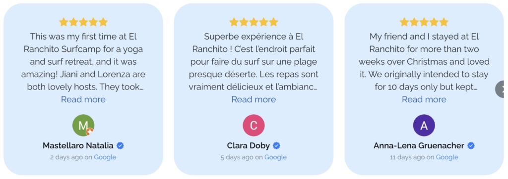 El Ranchito Surf Camp has earned strong guest praise for its welcoming hosts, relaxed family-style atmosphere, quality surf instruction, and the kind of peaceful setting that keeps people coming back. Reviews repeatedly highlight the beautiful property, good food, fun surf access, and a warm, personal experience that feels more authentic than a typical stay.