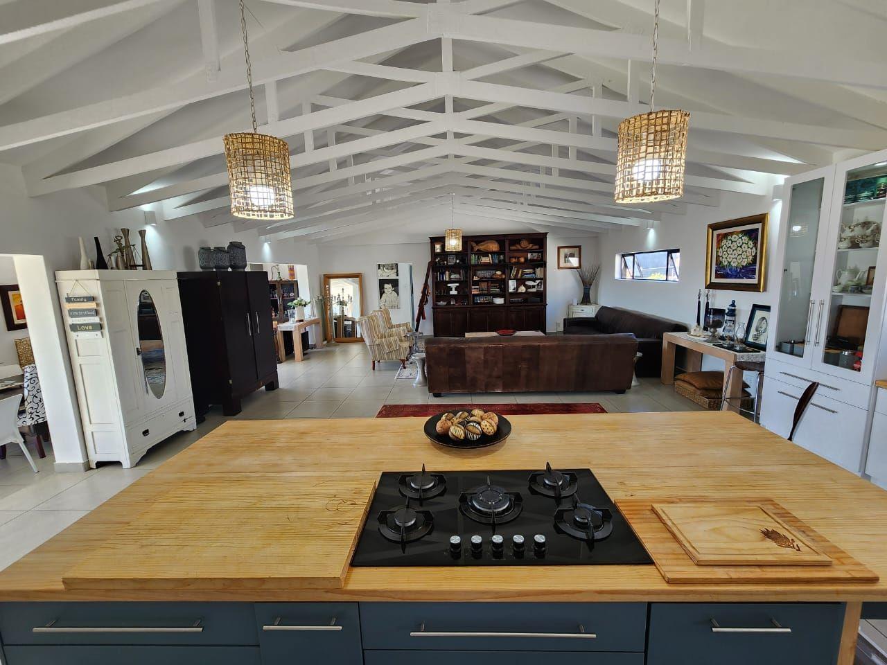 The heart of the home features an expansive open-plan layout that includes a welcoming lounge, a refined dining area, and a dedicated braai room tailor-made for entertaining. The modern kitchen is a chef’s delight, complete with a custom island, generous cupboard space, a gas hob, and dual eye-level ovens. A separate scullery accommodates a top-loader washing machine, dishwasher, and large tumble dryer, ensuring convenience without compromising on style.