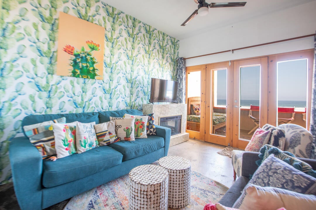 The living area is anchored by a cozy fireplace and framed by large glass doors that bring the ocean into view. Layered textiles, cheerful décor, and bold wallpaper create a warm, welcoming vibe. A comfortable sleeper sofa expands accommodations to up to four guests, adding flexibility and boosting short-term rental appeal.