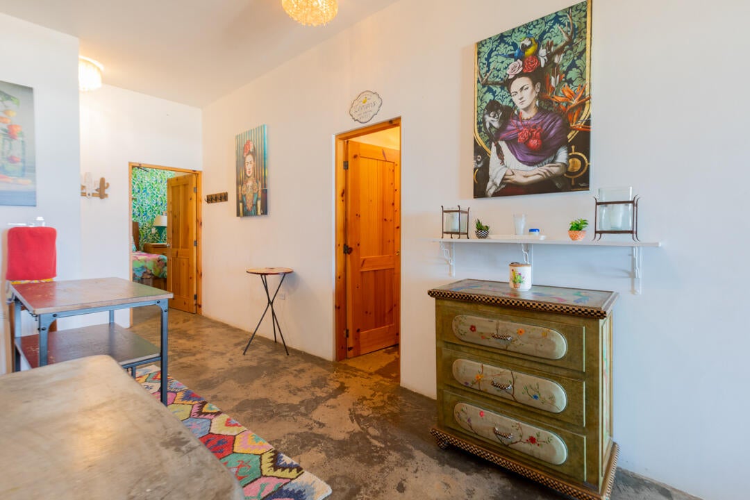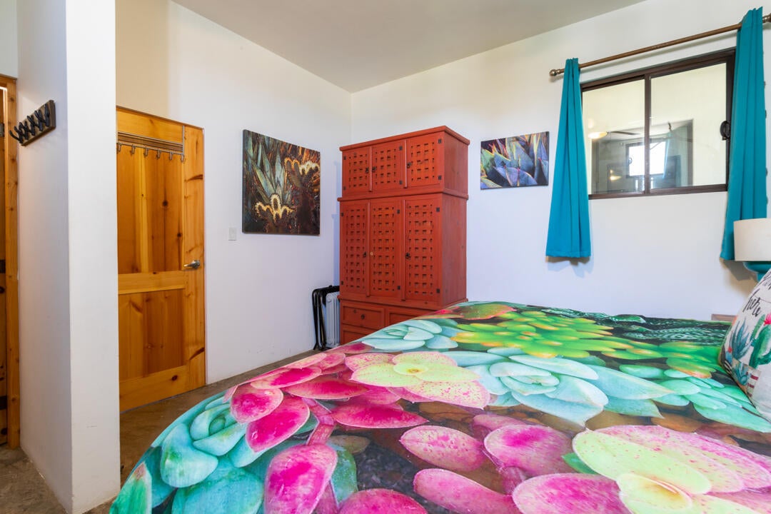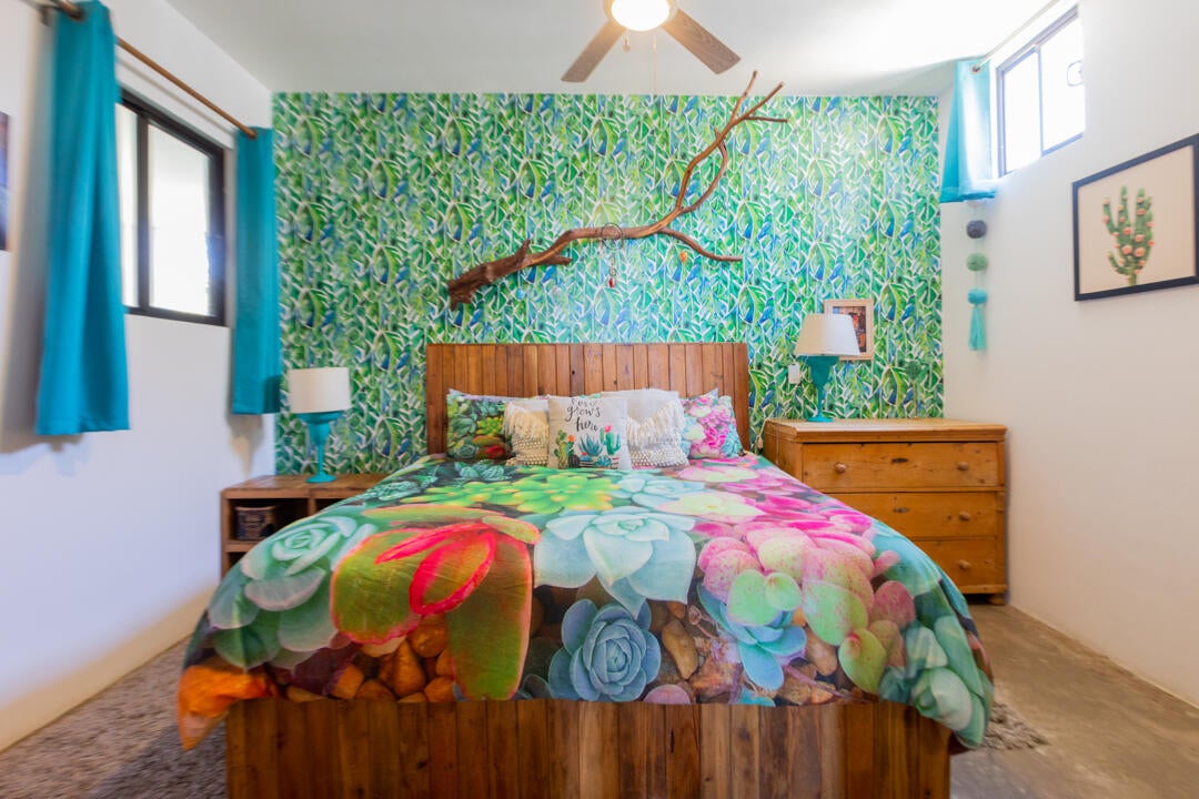 The bedroom is a calming retreat with a king-size bed, natural wood furnishings, lush botanical wallpaper, and mini-split A/C for comfort in every season. With two full bathrooms, owners and guests enjoy extra privacy and convenience—ideal for hosting friends or maximizing rental usability.