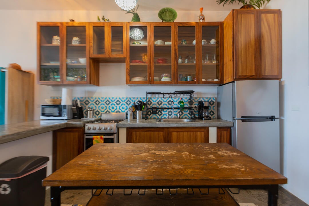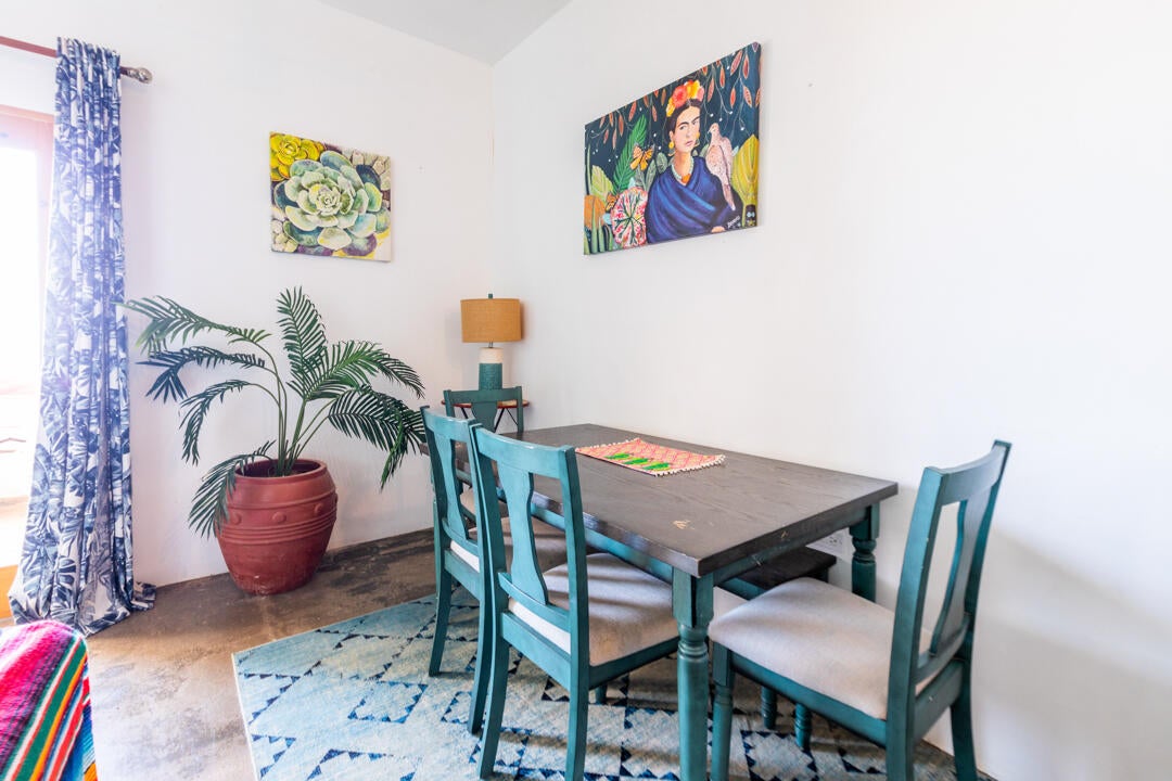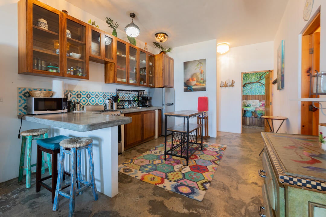 Inside, this Cerritos beach condo is full of color and personality—an inviting, photo-ready space that guests remember (and rebook). The open-plan kitchen features rich wood cabinetry, polished concrete countertops, and handcrafted artisanal mosaic tile that gives the home a playful, high-design feel. A central island and fully equipped layout make it easy to entertain or settle into relaxed, beach-paced evenings.